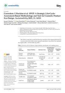 | Citer en APA 7: | L'Haridon, J., Patouillard, L., Pedneault, J., Boulay, A.-M., Witte, F., Vargas-Gonzalez, M., Bonningue, P., Rollat, I., Blanchard, T., Gonçalves, G., Hervio, A., & Gilbert, L. (2025). Correction: L'Haridon et al. SPOT: a strategic life-cycle-assessment-based methodology and tool for cosmetic product eco-design. Sustainability 2023, 15, 14321. Sustainability, 17(12), 5414-5414. https://doi.org/10.3390/su17125414 |