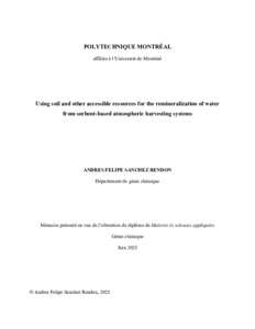 | Citer en APA 7: | Sanchez Rendon, A. F. (2025). Using Soil and Other Accessible Resources for the Remineralization of Water from Sorbent-Based Atmospheric Harvesting Systems [Mémoire de maîtrise, Polytechnique Montréal]. PolyPublie. https://publications.polymtl.ca/66394/ |