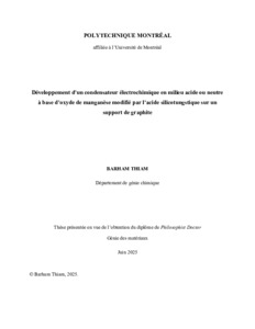 | Citer en APA 7: | Thiam, B. (2025). Développement d'un condensateur électrochimique en milieu acide ou neutre à base d'oxyde de manganèse modifié par l'acide silicotungstique sur un support de graphite [Thèse de doctorat, Polytechnique Montréal]. PolyPublie. https://publications.polymtl.ca/66537/ |