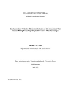 | Citer en APA 7: | Cruciata, P. (2025). Development and Validation of Innovation Indicators to Help Companies in their Decision-Making Process Regarding the Introduction of new Technologies [Thèse de doctorat, Polytechnique Montréal]. PolyPublie. https://publications.polymtl.ca/67851/ |