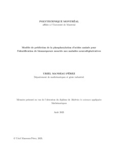 | Citer en APA 7: | Manseau-Pérez, U. (2025). Modèle de prédiction de la phosphorylation d'acides aminés pour l'identification de biomarqueurs associés aux maladies neurodégénératives [Mémoire de maîtrise, Polytechnique Montréal]. PolyPublie. https://publications.polymtl.ca/68170/ |