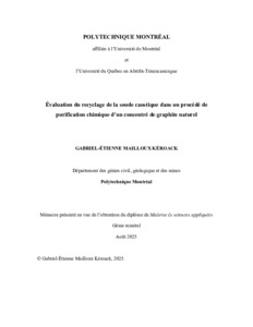 | Citer en APA 7: | Mailloux Keroack, G. E. (2025). Évaluation du recyclage de la soude caustique dans un procédé de purification chimique d'un concentré de graphite naturel [Mémoire de maîtrise, Polytechnique Montréal]. PolyPublie. https://publications.polymtl.ca/68409/ |