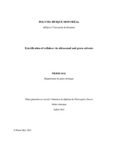 | Citer en APA 7: | Dal, P. (2025). Esterification of Cellulose Via Ultrasound and Green Solvents [Thèse de doctorat, Polytechnique Montréal]. PolyPublie. https://publications.polymtl.ca/68852/ |