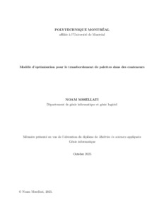 | Citer en APA 7: | Mssellati, N. (2025). Modèle d'optimisation pour le transbordement de palettes dans des conteneurs [Mémoire de maîtrise, Polytechnique Montréal]. PolyPublie. https://publications.polymtl.ca/70098/ |