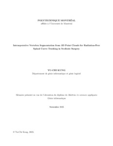 | Citer en APA 7: | Kung, Y.-C. (2025). Intraoperative Vertebra Segmentation From 3D Point Clouds for Radiation-Free Spinal Curve Tracking in Scoliosis Surgery [Mémoire de maîtrise, Polytechnique Montréal]. PolyPublie. https://publications.polymtl.ca/70103/ |
