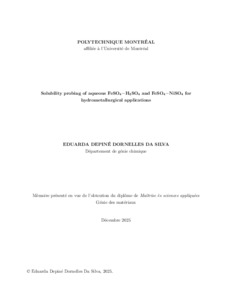 | Citer en APA 7: | Depiné Dornelles Da Silva, E. (2025). Solubility Probing of Aqueous FeSO4–H2SO4 and FeSO4–NiSO4 for Hydrometallurgical Applications [Mémoire de maîtrise, Polytechnique Montréal]. PolyPublie. https://publications.polymtl.ca/71953/ |